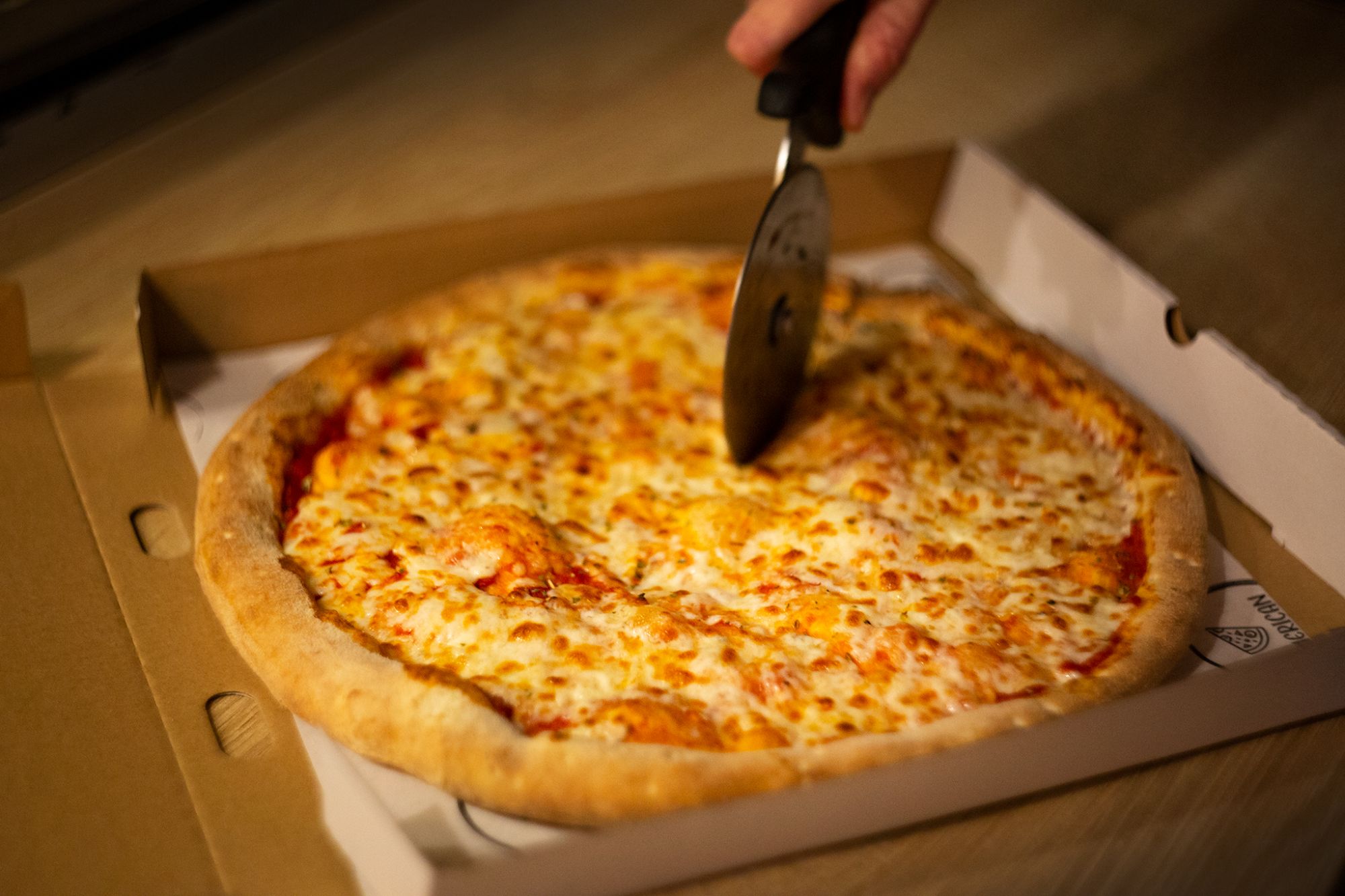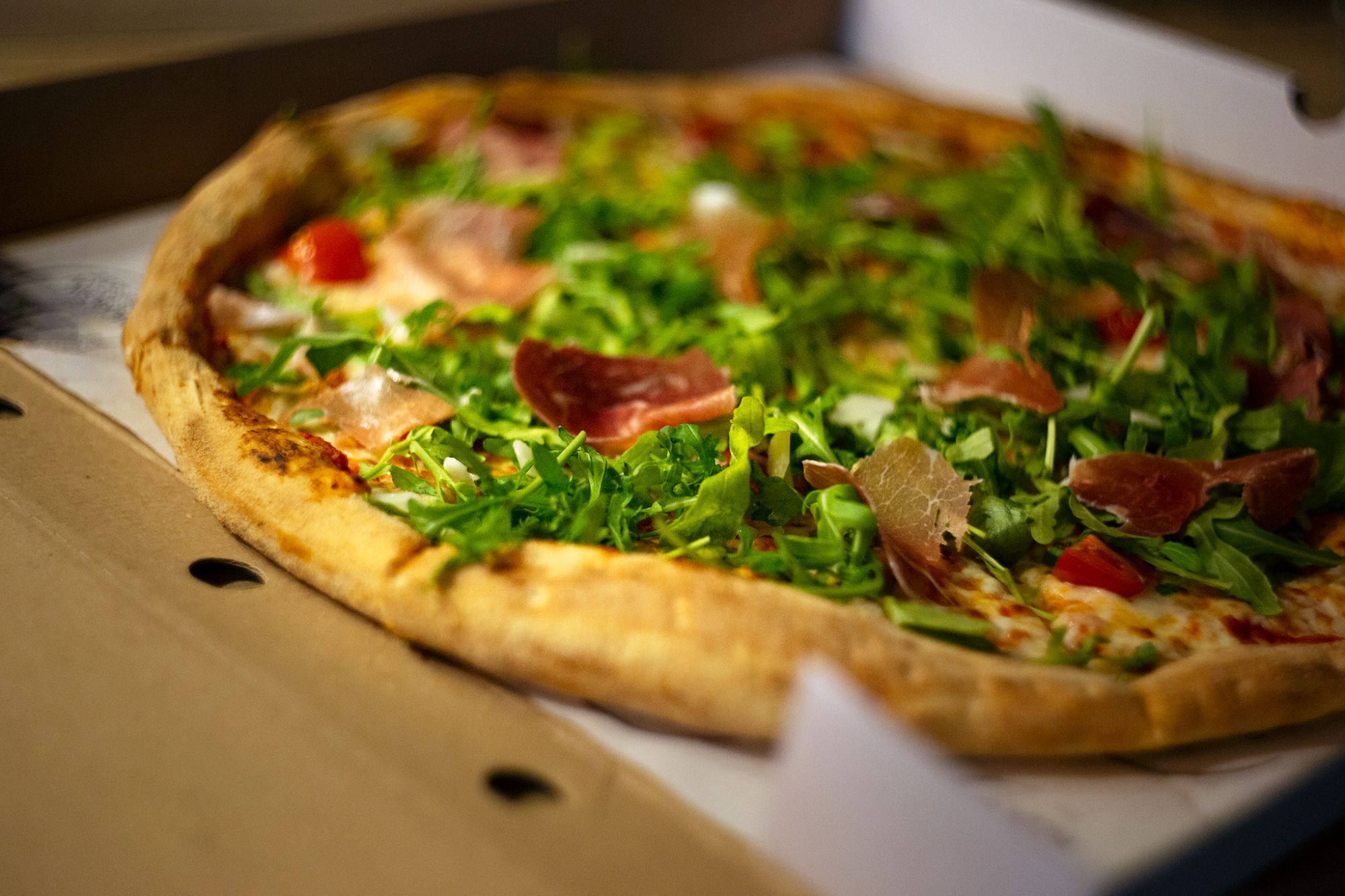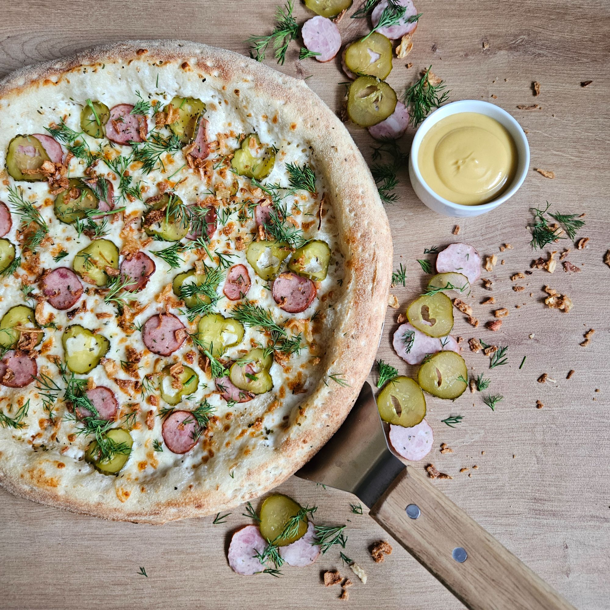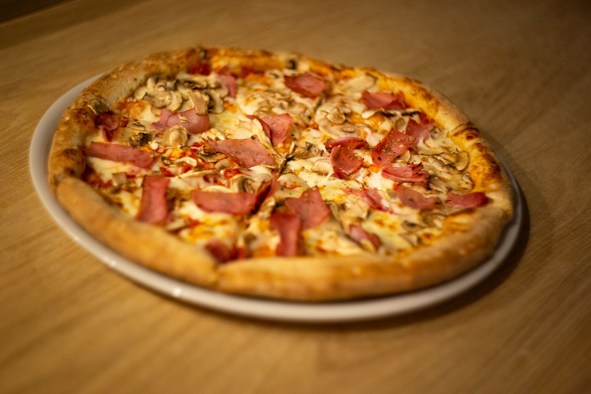 sos z pomidorów, ser mozzarella, pieczarki, boczek, kukurydza, czerwona cebula -