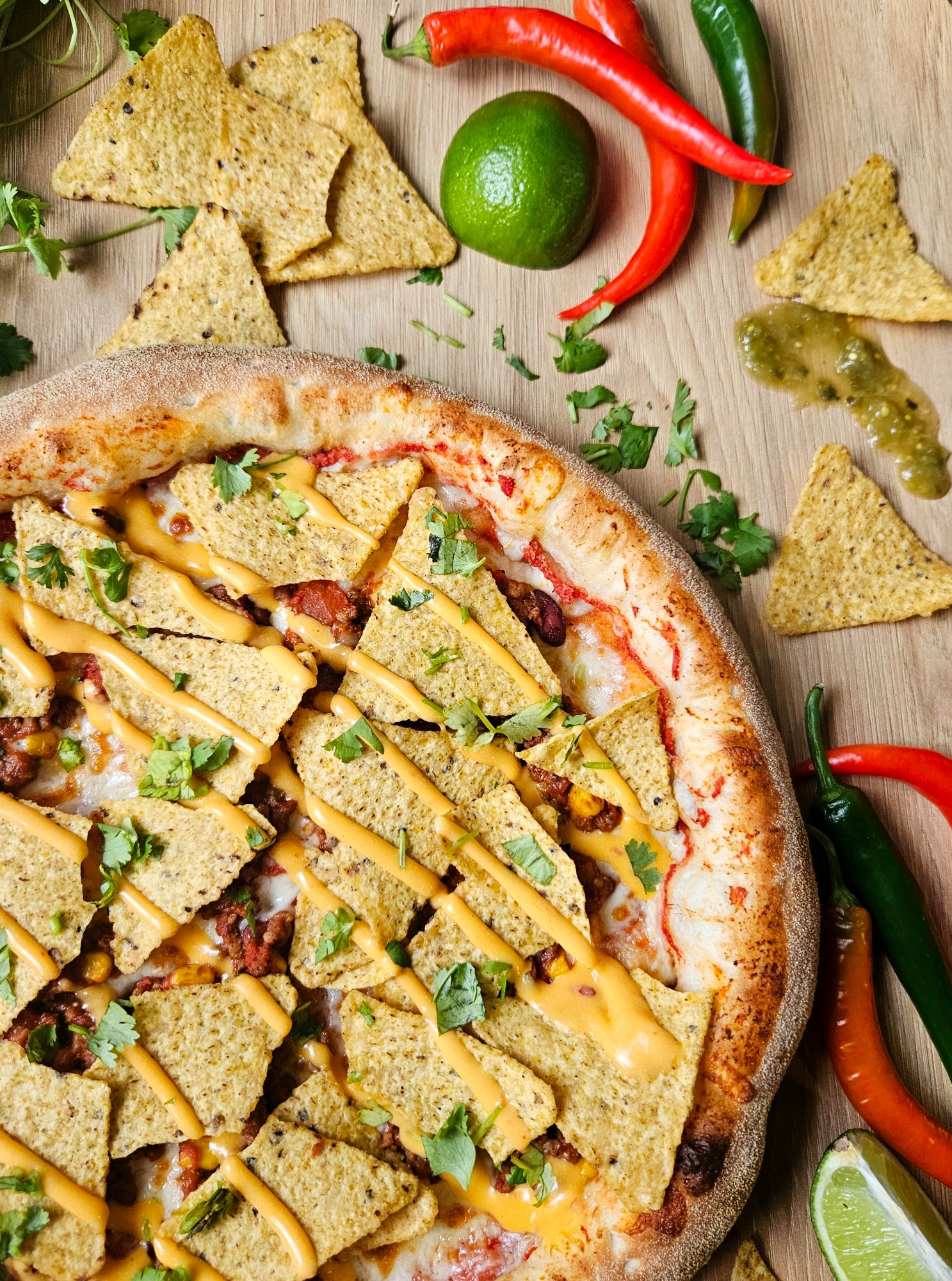 sos z pomidorów, ser mozzarella, chorizo, jalapeno, kukurydza, czerwona fasola, oregano -