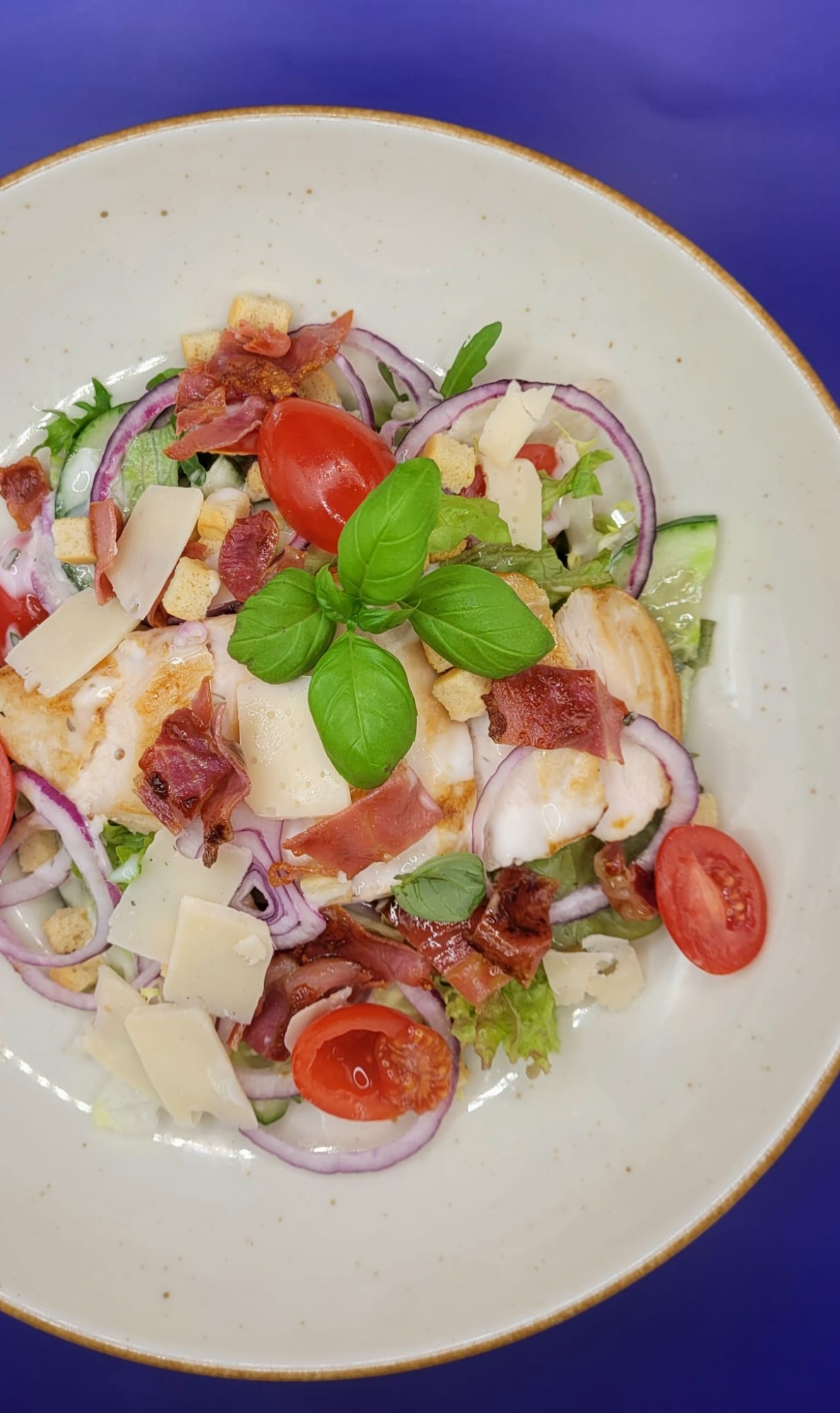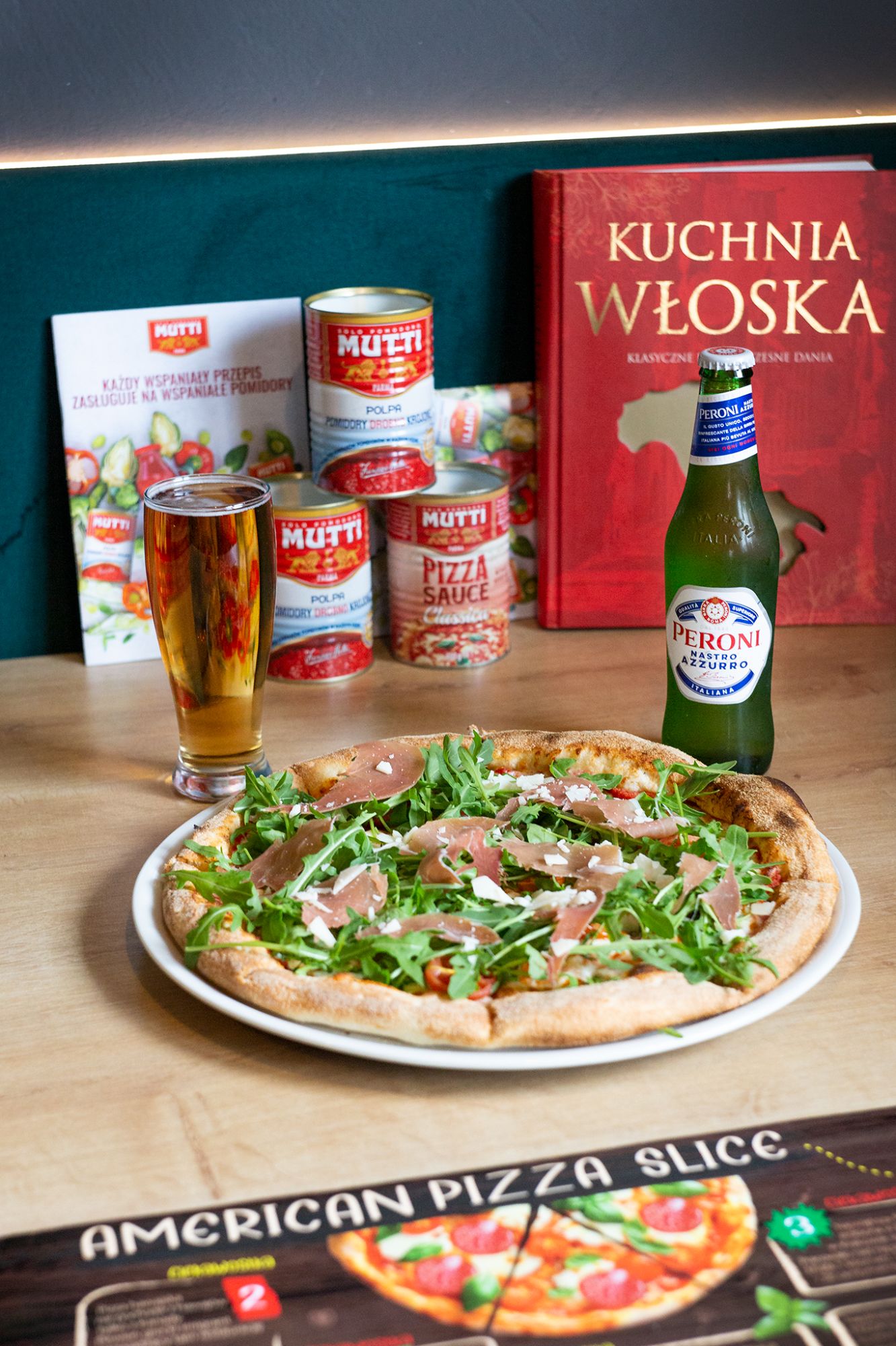 sos z pomidorów, ser mozzarella, szynka parmeńska, pomidory koktajlowe, rukola, parmezan, oregano -