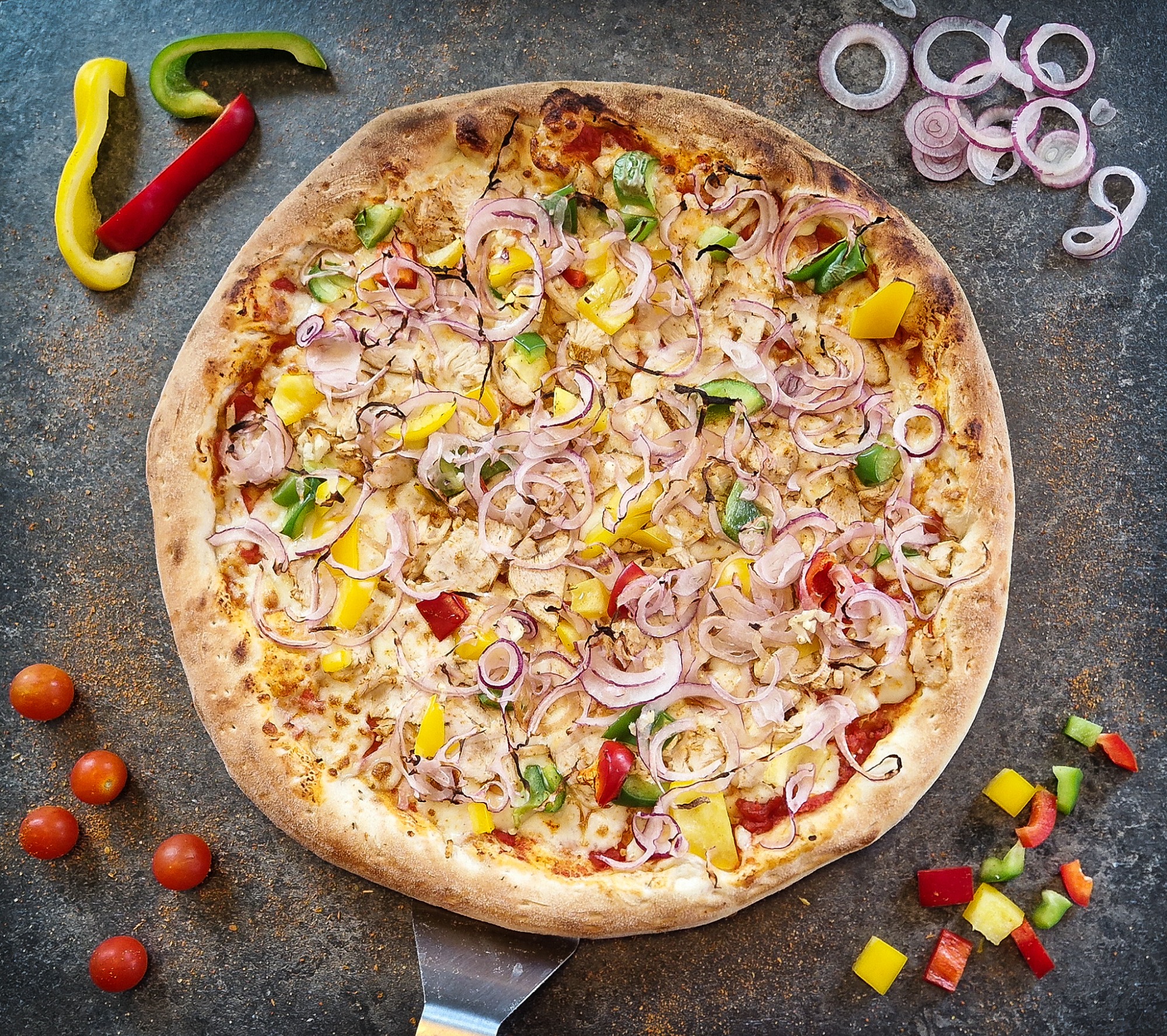 boczek, czerwona cebula, kukurydza, pieczarki, sos z pomidorów, ser mozzarella